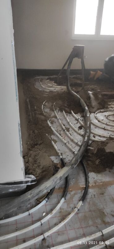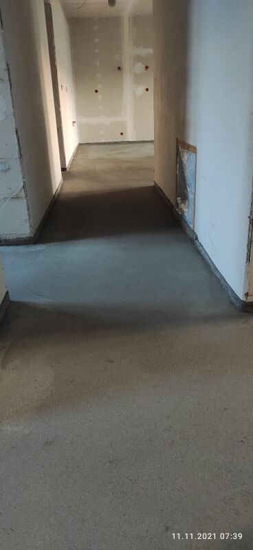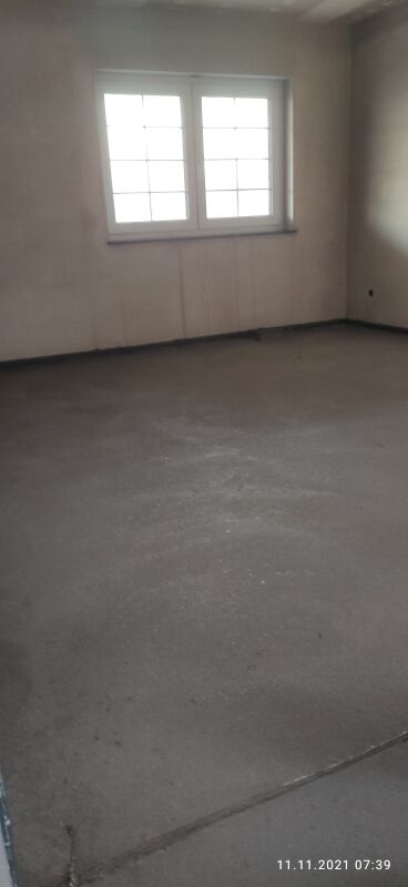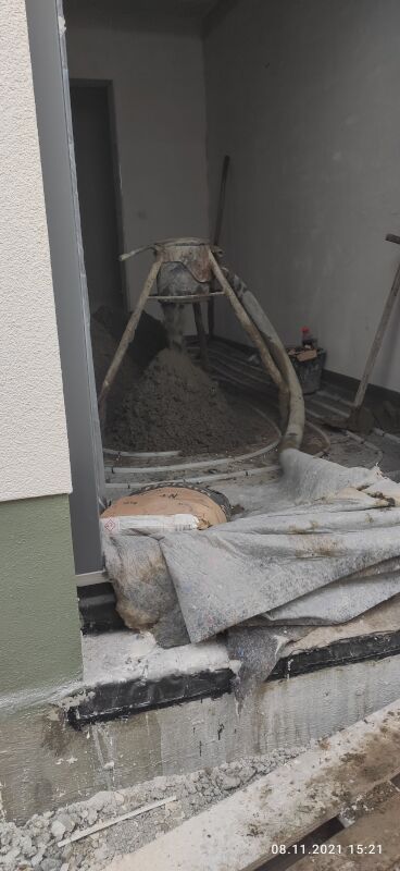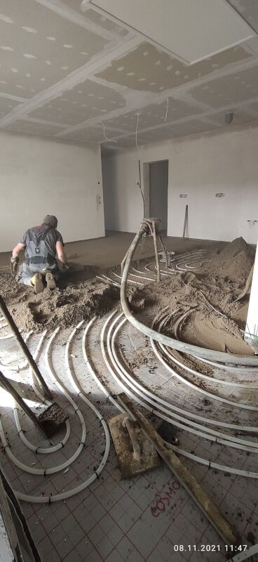 Am 8. November wurde der Beton-Estrich eingebracht. Ab dann hieß es für drinnen erst einmal „Pause“. Nach 3 Tagen durften wir dann regelmäßig Lüften, die Bau-Heizung prüfen und in die Zimmer verteilen und die Bautrockner kontrollieren, ob sie überhaupt arbeiten.