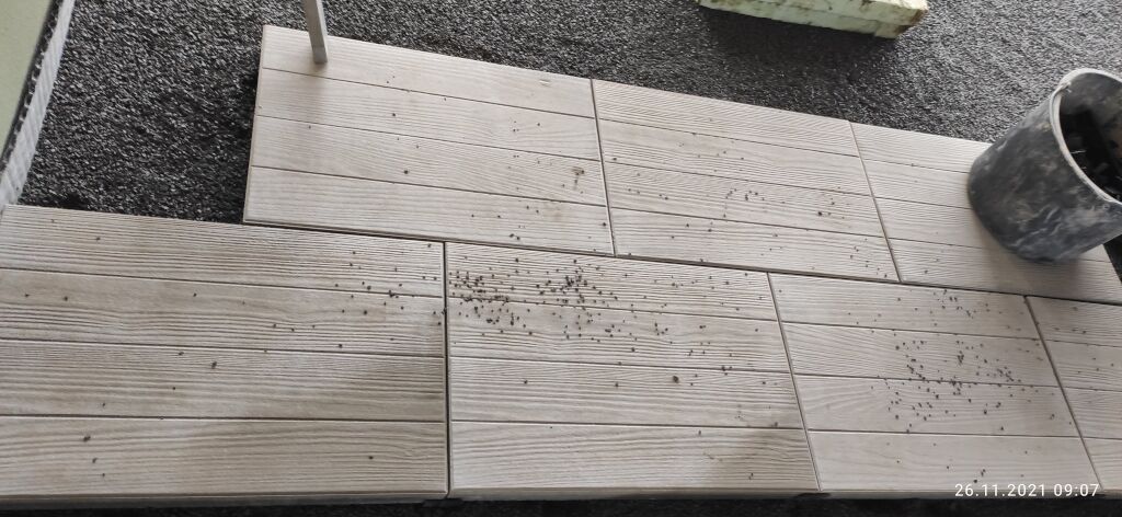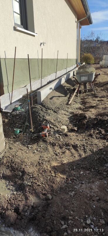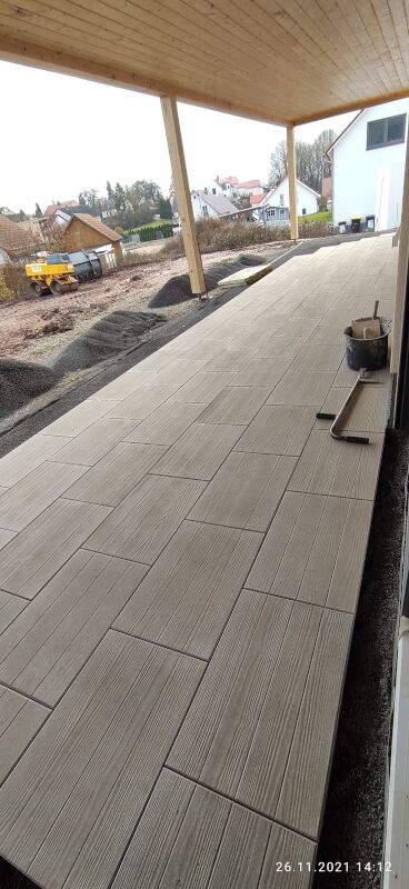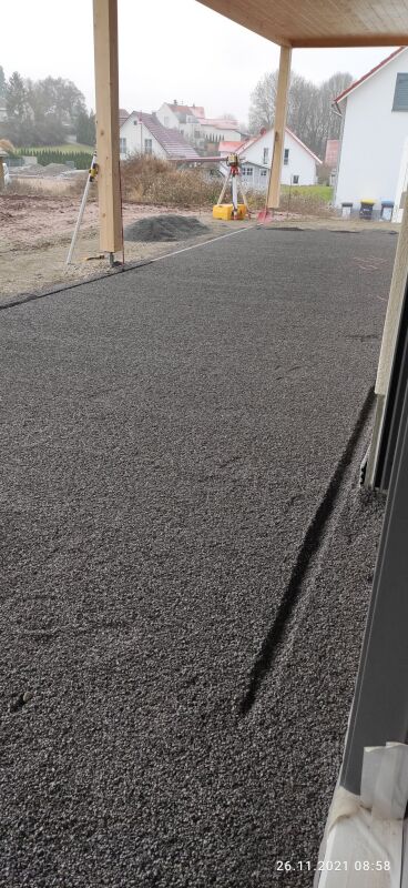 Parallel zur Kiestraufe, kümmerte man sich auch um die nächsten Schritte für die Terrasse: Split verteilen und abziehen und dann pflastern 🙂