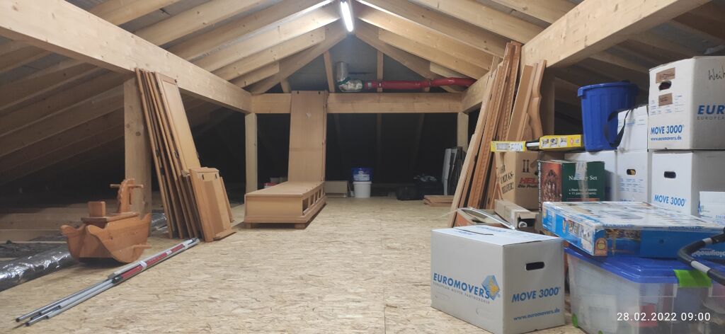 Der Dachboden wurde von uns mit OSB-Platten ausgebrettert. Zunächst nur im mittleren Bereich. Damit gab es ausreichend Platz, um einen Kleiderschrank aufzubauen, der für die Wintergarderobe gedacht ist.